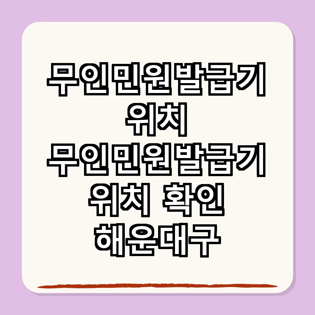 해운대구 내 위치한 무인민원발급기는 주민들이 자주 찾는 장소에 위치해 있어 매우 유용합니다. 각 발급기는 다양한 서류를 발급할 수 있으며, 이용자 편의를 고려하여 적절한 장소에 배치되어 있습니다.