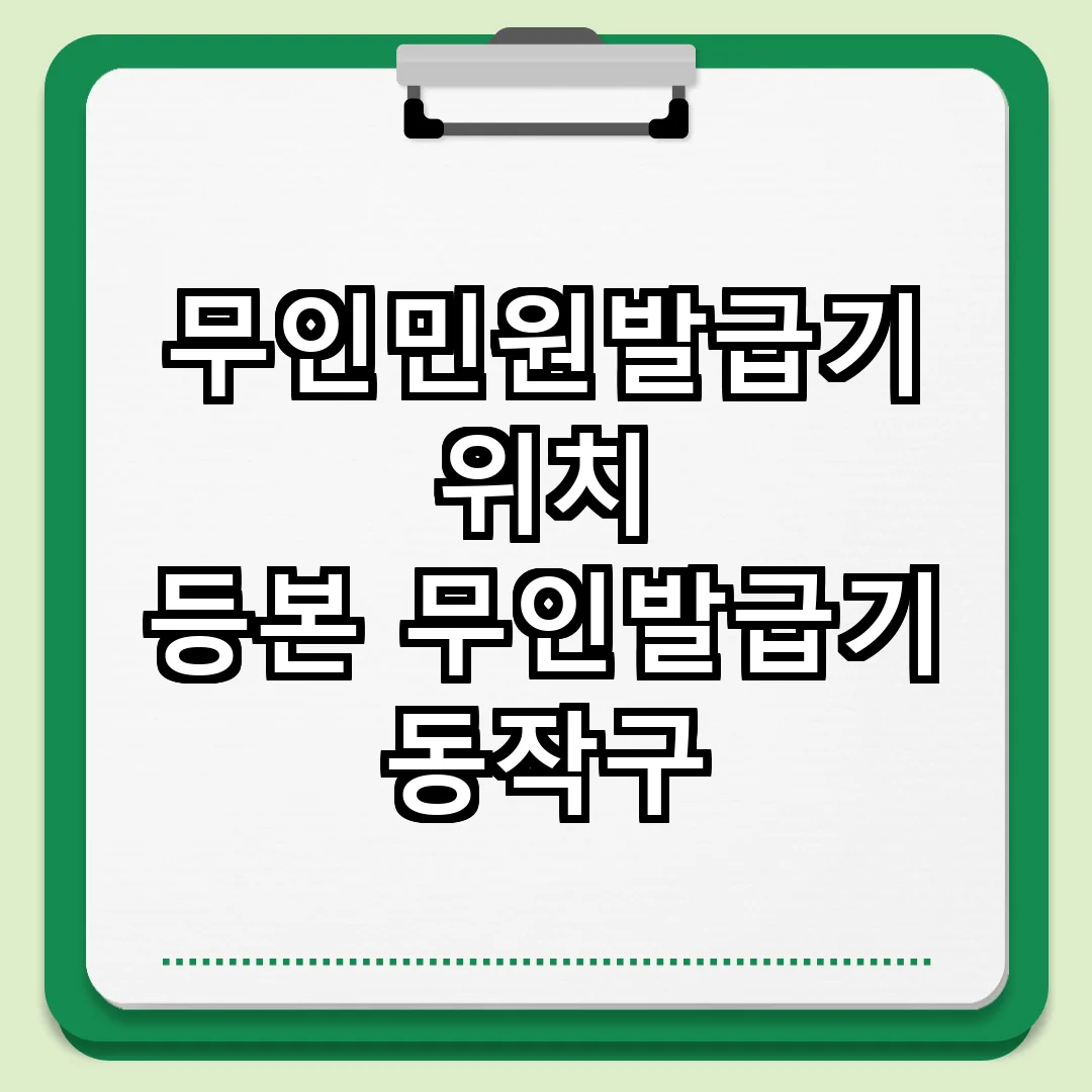 동작구에는 여러 곳에 무인민원발급기가 설치되어 있습니다. 주민센터, 도서관, 대형 마트 등 다양한 장소에서 쉽게 찾을 수 있습니다. 이용 시에는 해당 기계의 운영 시간을 확인하고, 필요 서류를 미리 준비해 가는 것이 좋습니다. 이렇게 하면 더욱 빠르고 효율적으로 서비스를 이용할 수 있습니다.